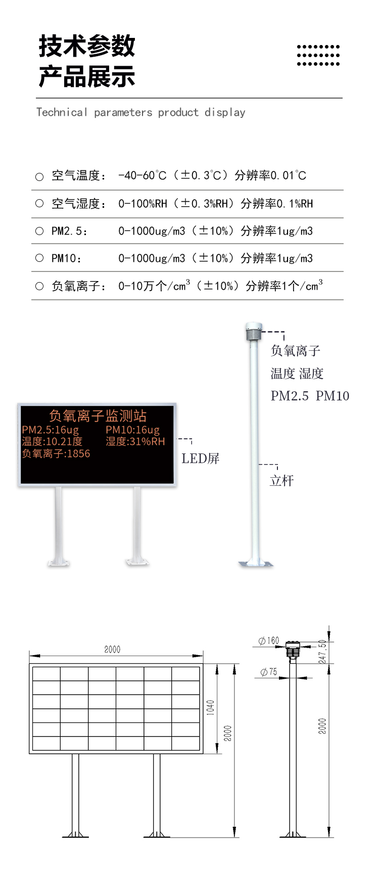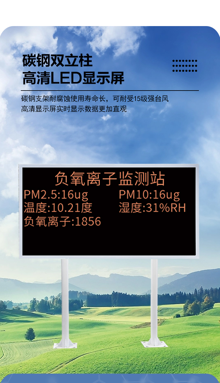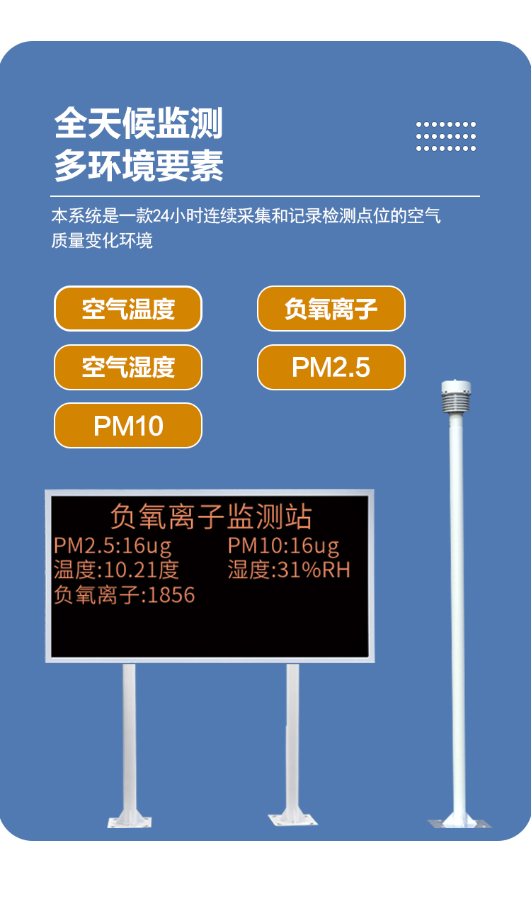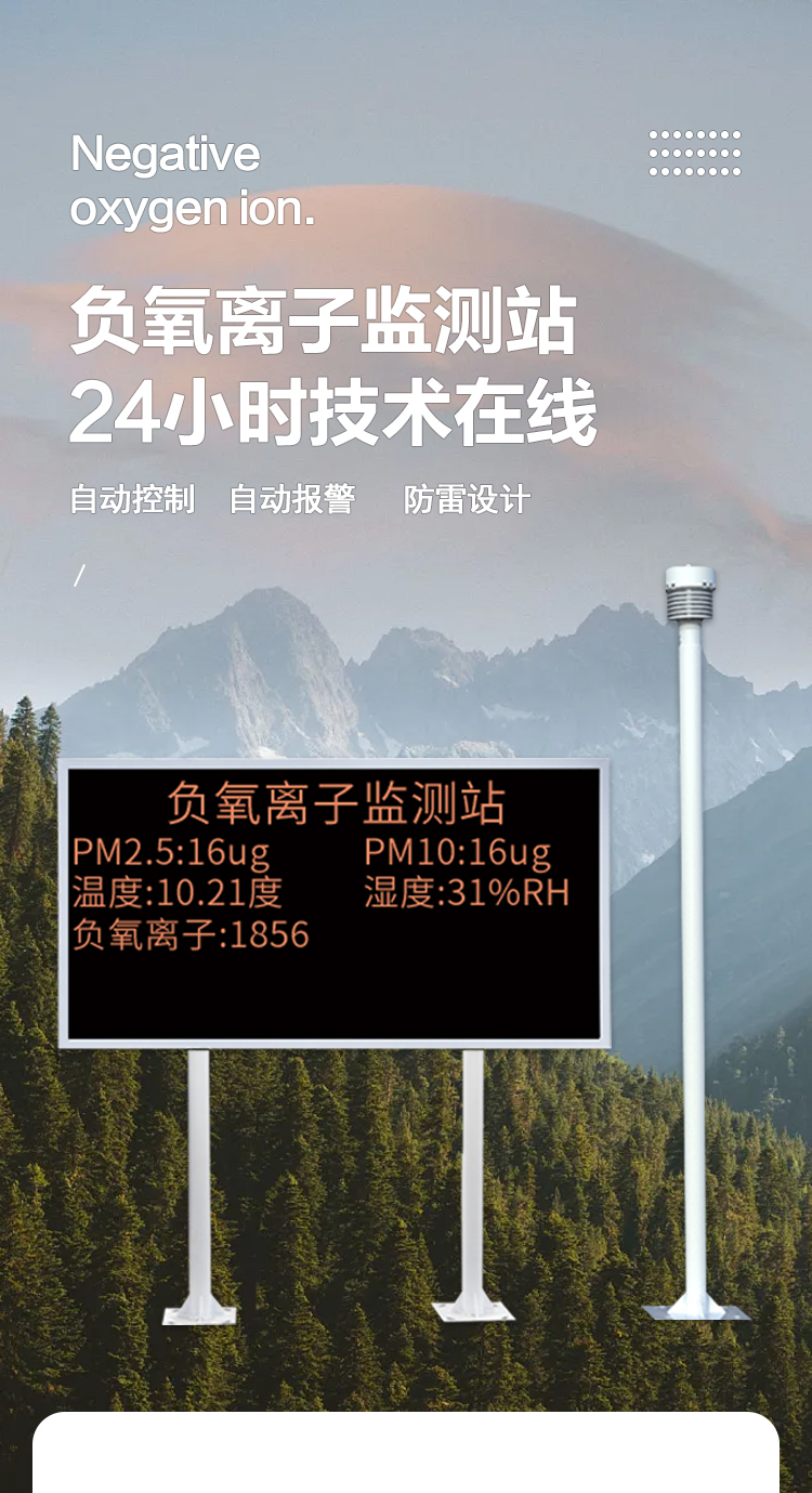 負氧離子在線監(jiān)測系統(tǒng)可全天候監(jiān)測空氣中負氧離子濃度,同時可根據(jù)用戶需求擴展監(jiān)測項目,如:空氣溫度、空氣濕度、PM2.5、PM10等氣象要素;模塊化結(jié)構(gòu)設(shè)計,傳感器都可以單獨替換,配備專業(yè)安裝支架,現(xiàn)場可通過LED屏幕直接讀取數(shù)據(jù),亦可遠程云平臺/WEB/微信公眾號實時查看數(shù)據(jù),后期運營維護方便。